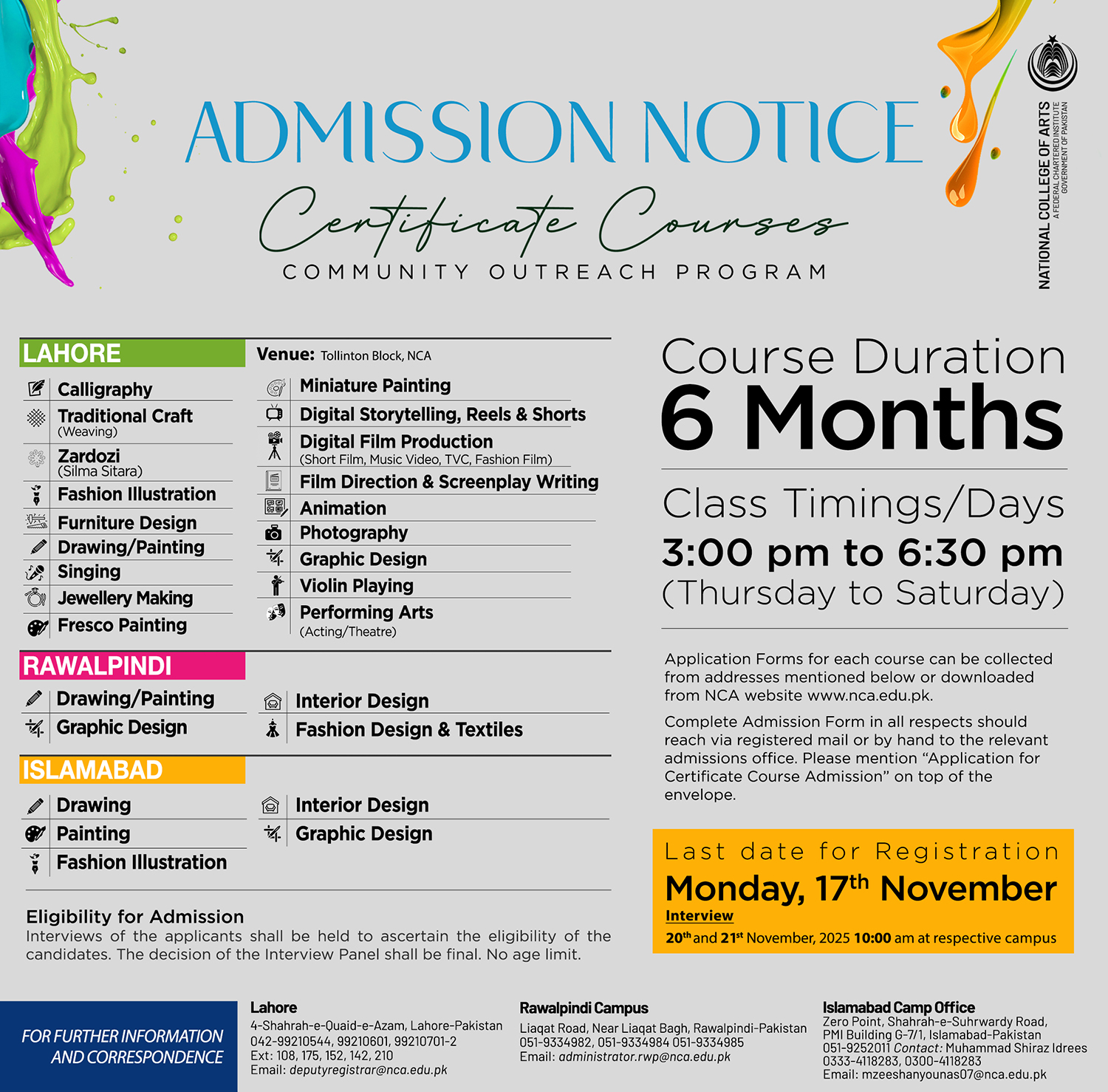 National College of Arts is holding 06 months certificate courses in Lahore, Rawalpindi and Islamabad Camp Office.