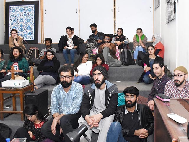A talk by Iranian artist Golrokh Nafisi and Sina Fakour who are participating in the Lahore biennale was held today at 14:30 at NCA LT1. The Iranian artist discussed her practice related to public space and collective memory in Tehran. Sina Fakour discussed his research on Persian and Arabic type and his practice. Students and faculty members from different departments attended the lecture session.